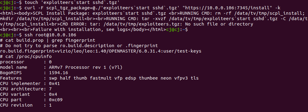 There is a breakdown on the vulnerability above, but the process can be summarized as a trivial command injection within a webserver’s POST request handler. For our example, my TV is at “10.0.0.106”, Replace that with the IPv4 address of your TV in all of the following examples.