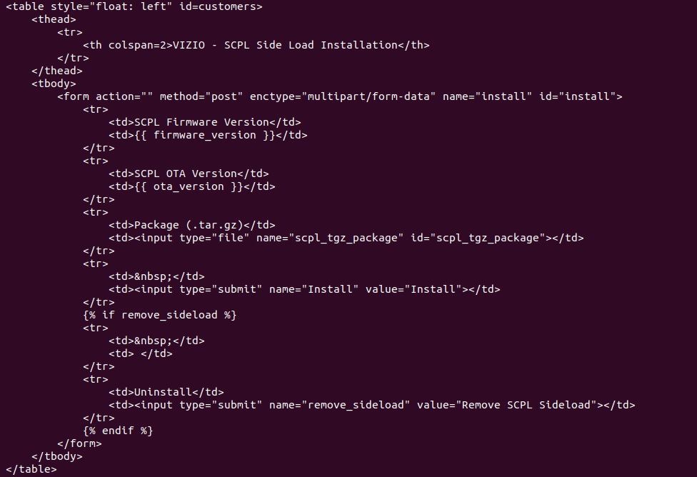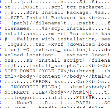 Digging inside of the “scpl” directory, leveraging the earlier knowledge of the filesystem (retrieved from a firmware dump) with a cursory run of strings on files led us to the “/install” endpoint, from this “SCPL Sideload” html file.