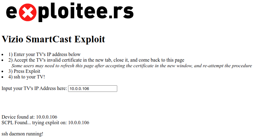 There is a very easy way to use this, visit our page below on your network and enter your TV’s IPv4 address, and follow the instructions. It will use queries to automatically enable sshd on your TV. Or, utilize the curl command further below if you want to see whats going on.