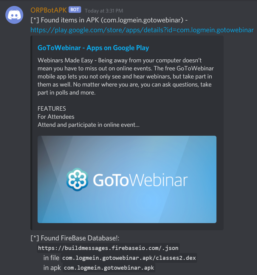 Therefore, today we would like to introduce you to what we’ve been internally calling The Exploiteer’s Open Research Project (ORP). ORP will consist of a number of chat bots conducting automated research on different items including fuzzing open source projects, auditing APKs, and performing IOT firmware analysis. These bots would then output all results to our Discord chat server for analysis by the Exploitee.rs security community within designated channels. The project will start with the addition of our APK scanning bot which enumerates a list of top APKs within the Google Play store, then proceeds to search the APK and associated libraries for leaked credentials, databases, and private keys. After each round of APK downloading and analysis, the bot will restart allowing for constant testing of the newest top android mobile apps. We plan to evolve this bot to perform a deeper analysis of the APKs at a later point but will use the bots current output as a proof of concept for the general idea of crowdsourcing security analysis.
